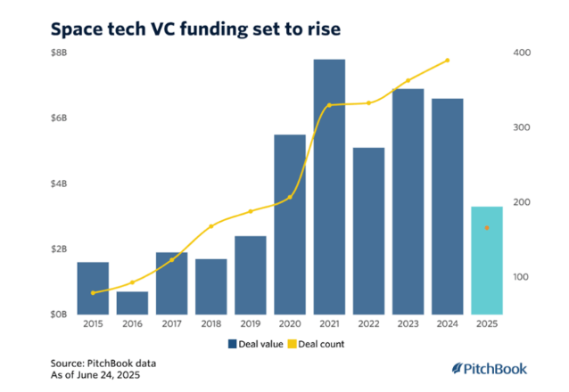 Investments in space technology are off to a strong start in the first half of 2025. The rising trend over the last four years, as mentioned in a previous Knobbe Martens Aerospace Blog post, appears to be continuing. The quantity of deals in space technology has “more than doubled in the past four years,” per Reuters. While the number of deals in 2025 may not exceed that of 2024, total deal value this year may surpass last year’s total of $6.6 billion.